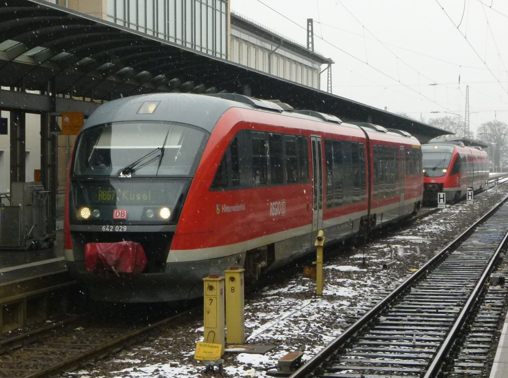 642 029 (Hinterweidental) steht als RB 67 Kaiserslautern - Kusel am 14.02.2012 in Kaiserslautern, hinten wartet ein 643er.