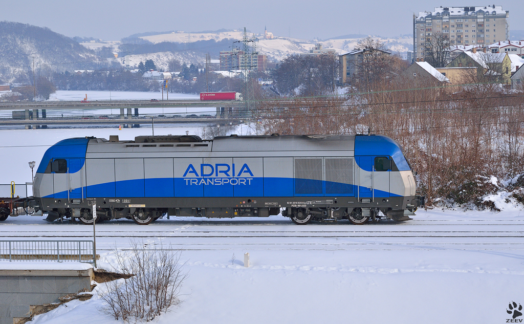 ADRIA Transport 2016 920 mit lehren Containerzug passiert Draubrücke Richtung Hafen Koper. / 13.02.2012