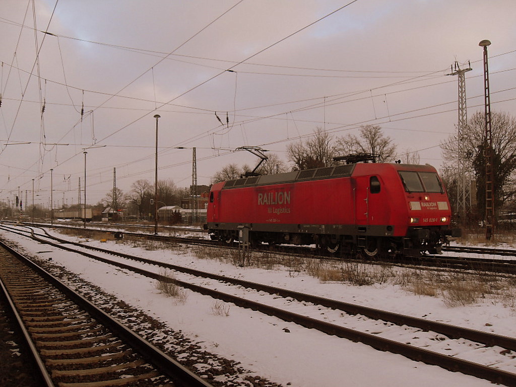 Am 13.02.2012 rangierte 145 026 um ihren LKW-Walterzug in Stendal drumrum.