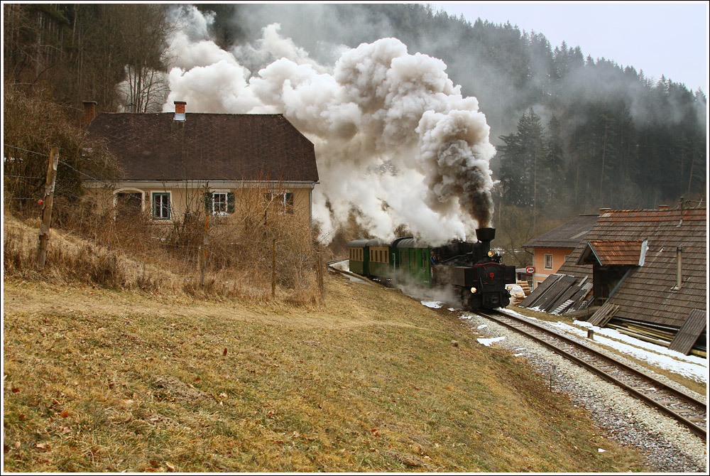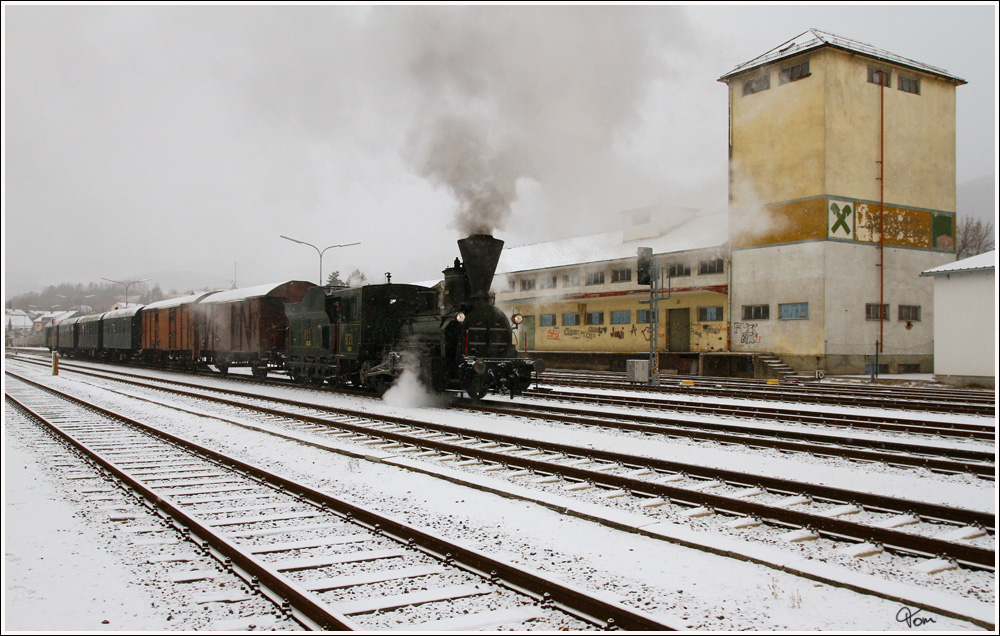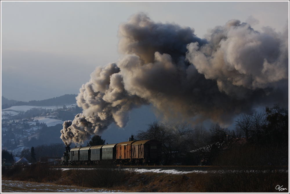 Für eine kleine Gruppe aus England gab es dieser Tage Winterdampf in der Steiermark. Hier sieht man die dienstälteste Dampflok der Welt, die 671 der Gkb mit dem SPZ 8448 auf der Fahrt von Köflach nach Graz Köflacherbahnhof.