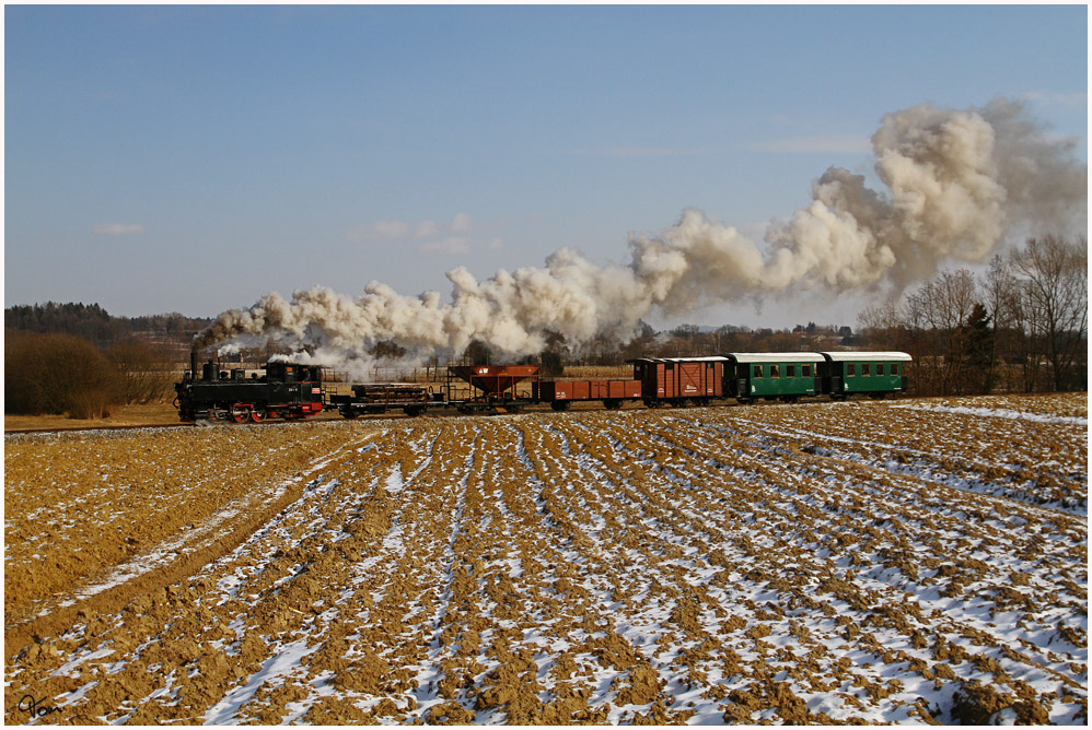 U8 im Zuge einer Sonderfahrt für eine englische Reisegruppe auf der Feistritztalbahn am 6.2.2012 in Parz kurz vor dem Grub Viadukt aufgenommen.