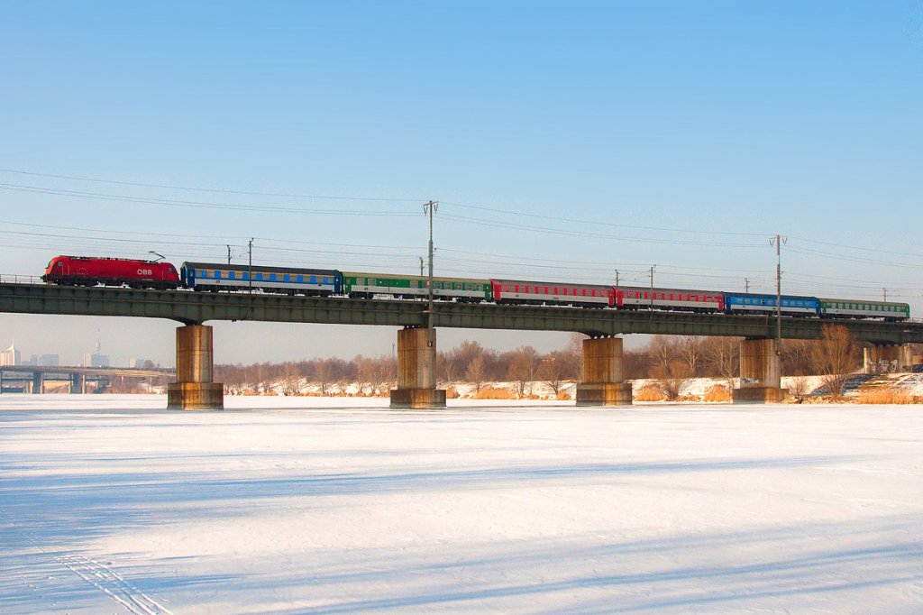 EC 77 ist von Prag nach Wr. Neustadt unterwegs und überquert am 12.02.2012 das an dieser Stelle bereits zugefrorene Wiener Entlastungsgerinne.