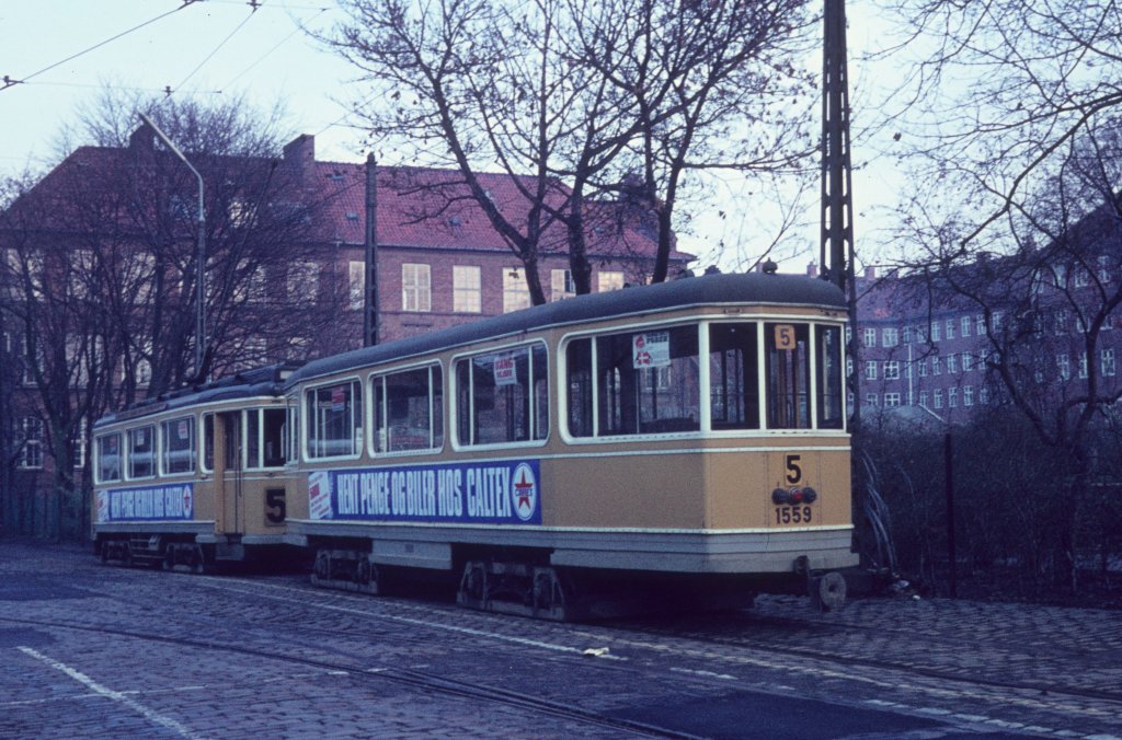 København / Kopenhagen Københavns Sporveje (KS) SL 5 (Bw 1559) im November 1968. Die HVZ nähert sich, der Zug ist zur Abfahrt vom Betriebsbahnhof Sundby bereit. - Scan eines Diapositivs.