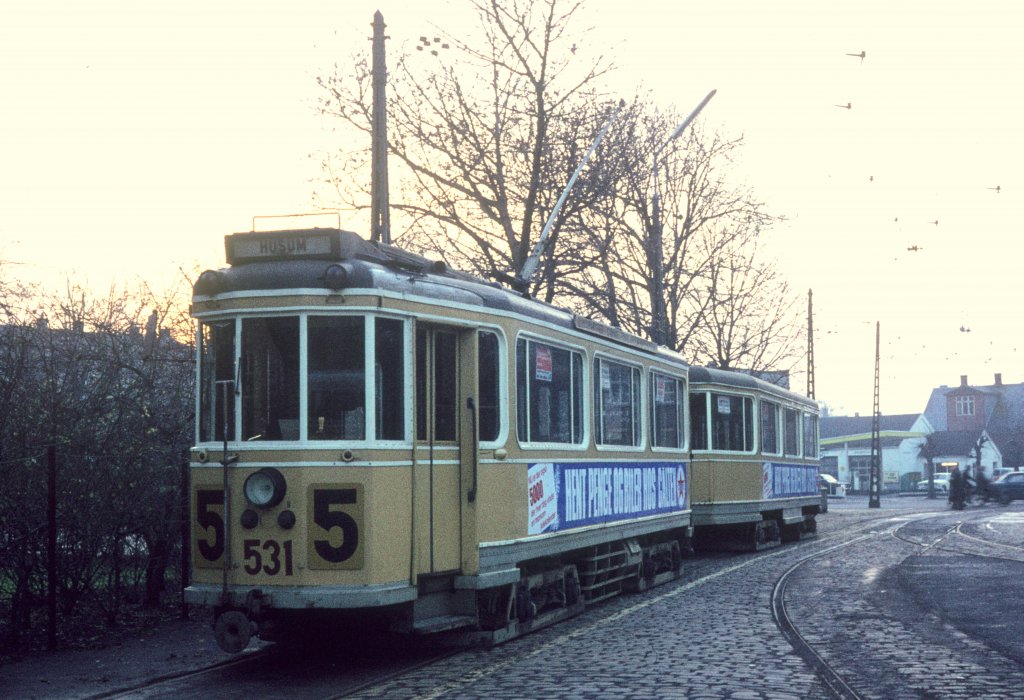 København / Kopenhagen Københavns Sporveje (KS) SL 5 (Tw 531 + Bw 15**) kurz vor der Abfahrt vom Betriebsbahnhof Sundby im Februar 1969. - Wenn die Straßenbahnwagen der Linie 5 ihren "Dienst" anfingen, mussten sie erst den Betriebsbahnhof über die Straße Amagerbrogade kurz verlassen (s. Bild vom DÜWAG/Kiepe-GT6 825, ID 573748) und dann wieder aufs Gebiet des Betriebsbahnhofes hineinfahren, d.h zweimal links abbiegen. Vom Standort des Beiwagens 1559 (s. Foto ID 574425) und dem des Großraumtriebwagens (dieses Bild), benutzte die Straßenbahnlinie danach eine Betriebsstrecke über die Straße Kretavej, um zur Verkehrsstrecke zu erlangen. Die Wagenhalle des Betriebsbahnhofes liegt hinter dem Fotografen. - Scan eines Diapositivs.