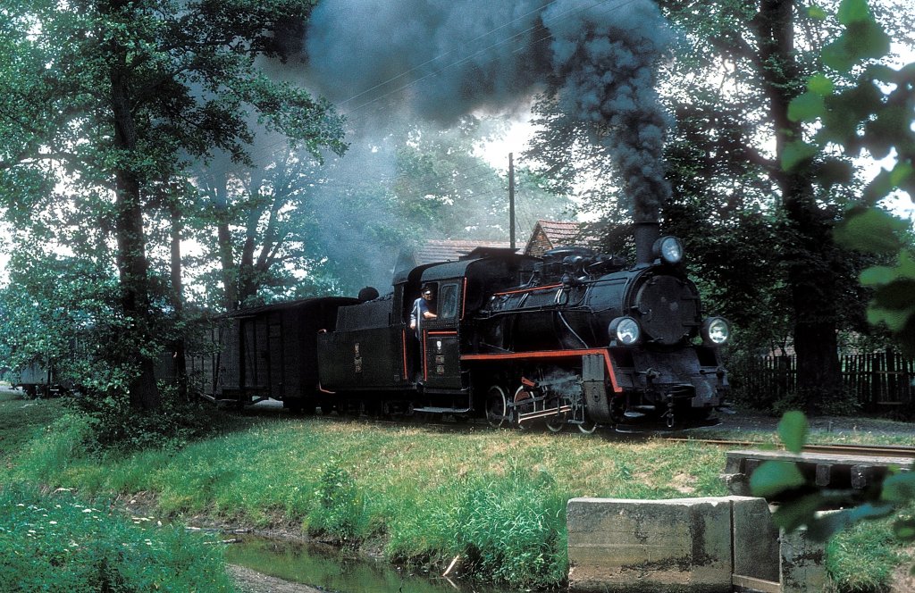 1010.09 mit einem gemischten Güterzug bei Saalfelden. Juli 1986