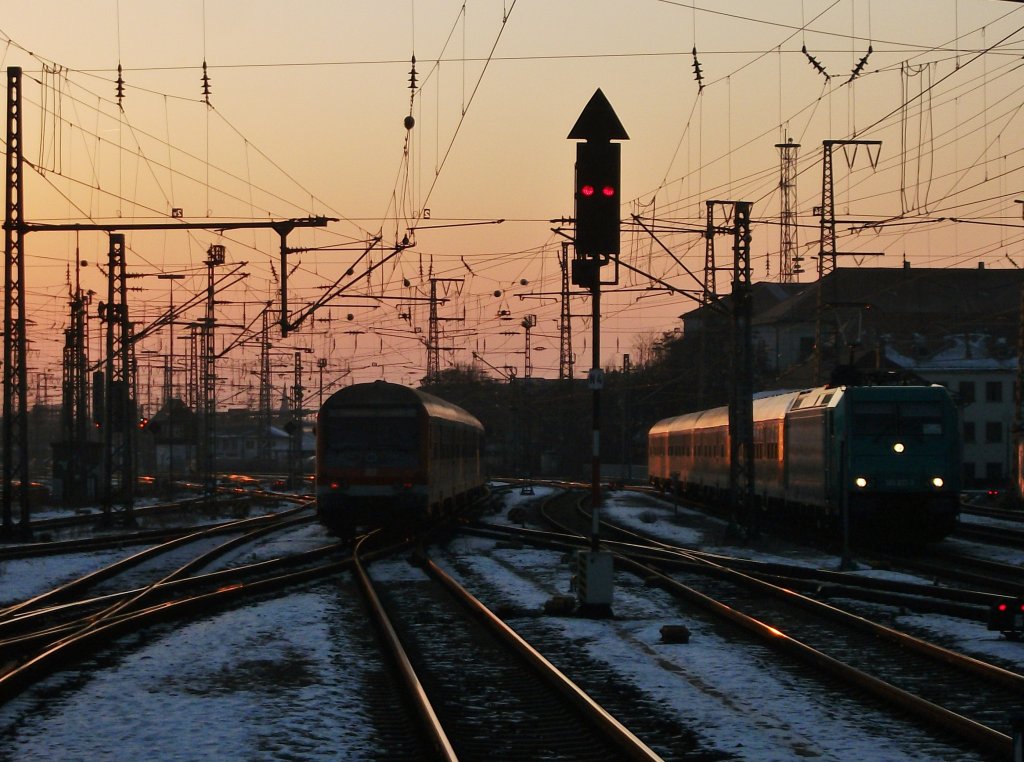 Sonnenuntergangsstimmung am 11.Februar 2012 im Nürnberger Hbf. Zu sehen sind die S3 nach Nemarkt und eine RB Richtung Treuchtlingen.