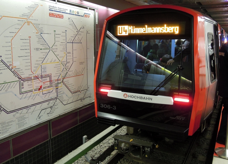 Zweiter Versuch:(kein Super-Foto, aber informativ). Vorstellung des neuen Hamburger U-Bahnzuges DT 5 im Bahnhof Jungfernstieg, 28.1.2012