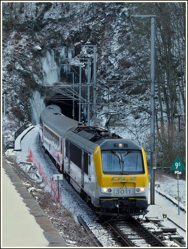 - Winterimpressionen - Der IR 112 verlässt am 10.02.2012 den Tunnel Féischterhaff in Goebelsmühle in nördlicher Richtung. (Hans)