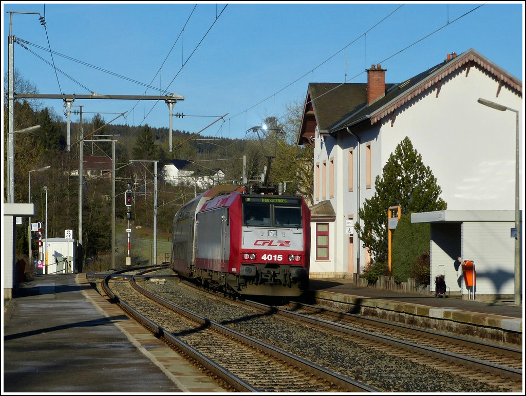 - Winterimpressionen - Mit viel Bügelfeuer drückt die 4015 ihre DoStos am 16.01.2012 aus dem Bahnhof von Wilwerwiltz. (Jeanny)