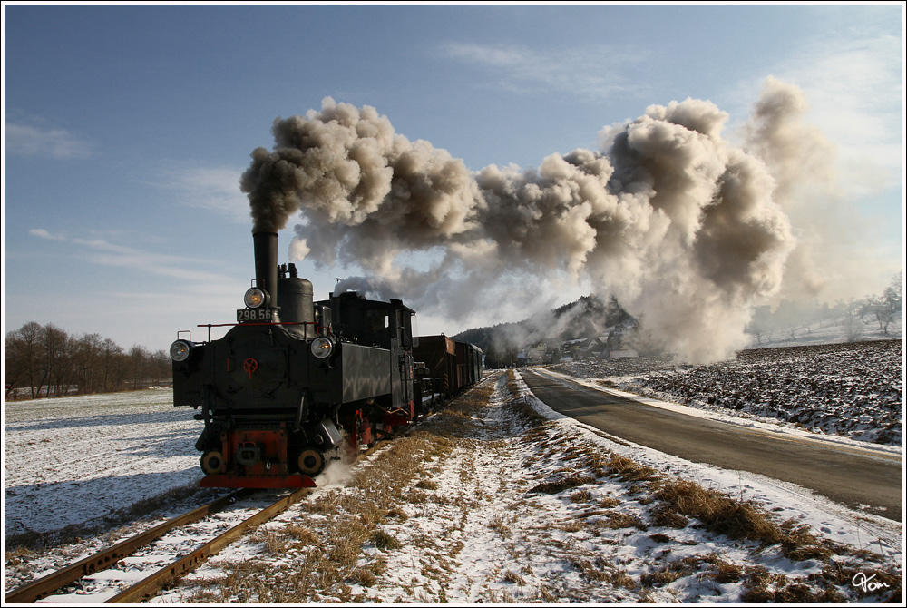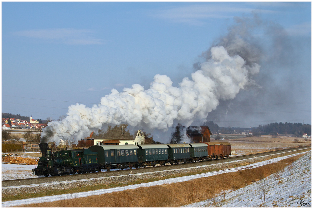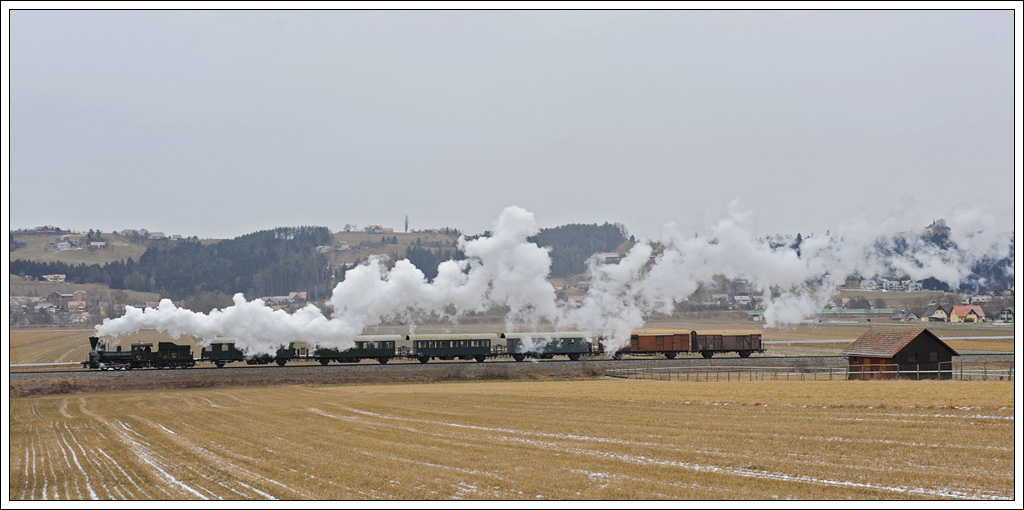 Für eine kleine Gruppe aus England gab es dieser Tage Winterdampf in der Steiermark. Hier sieht man die dienstälteste Dampflok der Welt, die 671 der Gkb mit dem SPZ 8519 auf der Fahrt von Graz Köflacherbahnhof nach Wies Eibiswald. Gussendorf 5.2.2012