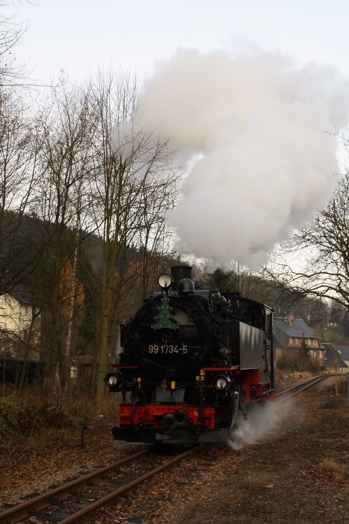 Bereits zum 2. mal fand im oberen Abschnitt der Weißeritztalbahn am 1. Advent Fahrbetrieb statt. 99 734 setzt am 26.11.11 im Bahnhof Obercarsdorf um.