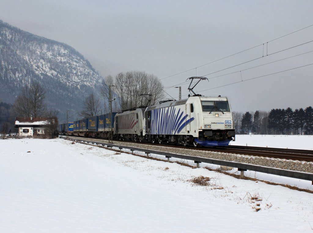 Die 185 662 und die 186 284 mit einem KLV-Zug unterwegs bei Niederaudorf.