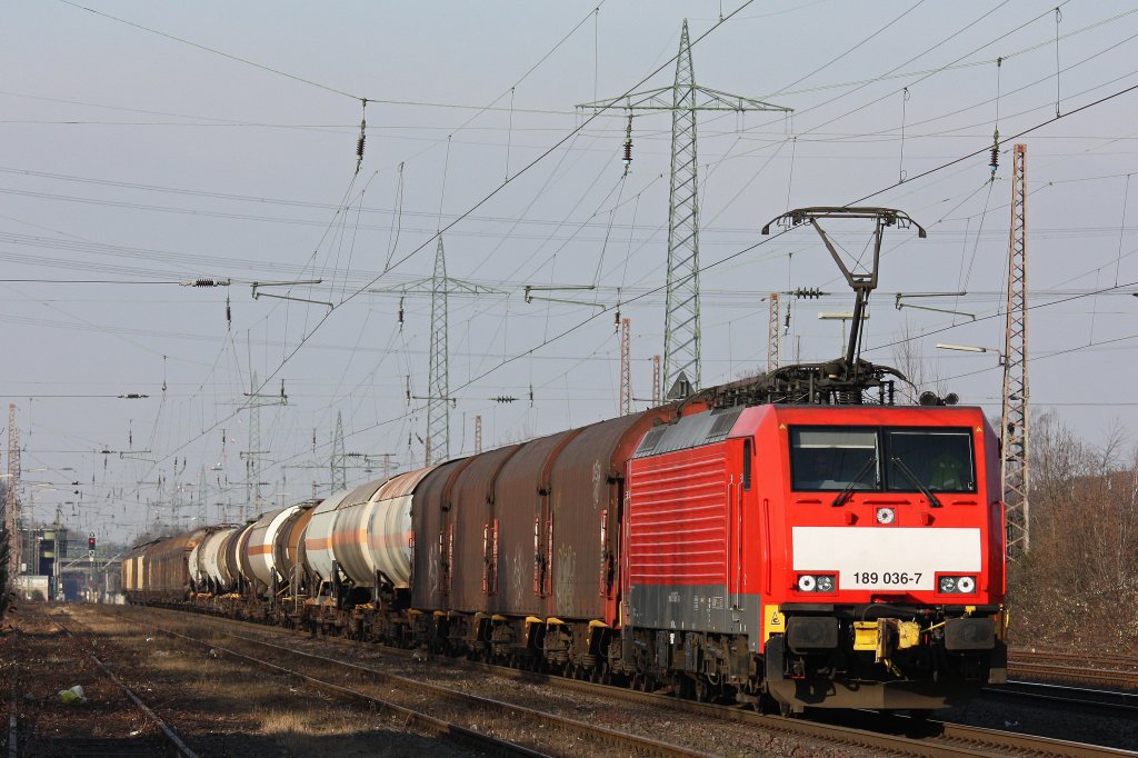 Die 189 036 fuhr am 11.2.12 mit einem gemischten Güterzug durch Ratingen-Lintorf.