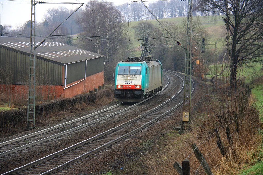 Die Cobra 2807 kommt als Lokzug aus Aachen-West nach Belgien Aufgenommen bei Reinartzkehl bei Regenwolken am 16.2.2012.