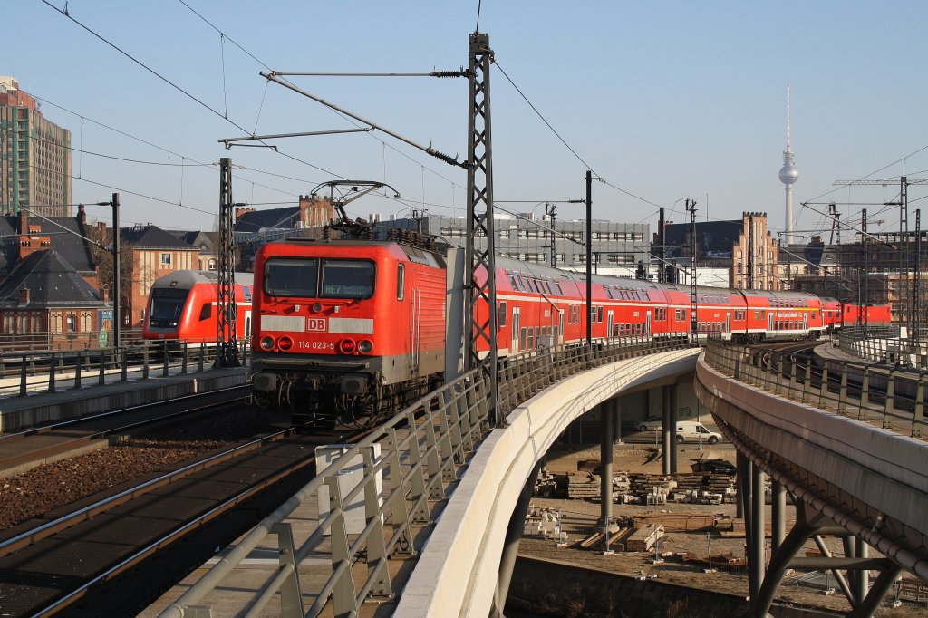 Hier links ein RE1 von Frankfurt(Oder) nach Berlin Charlottenburg und rechts 114 023-5 mit einem RE7 von Berlin Zoologischer Garten nach Wünsdorf-Waldstadt, diese beiden Züge begegneten sich am 30.1.2012 in Berlin Hbf.