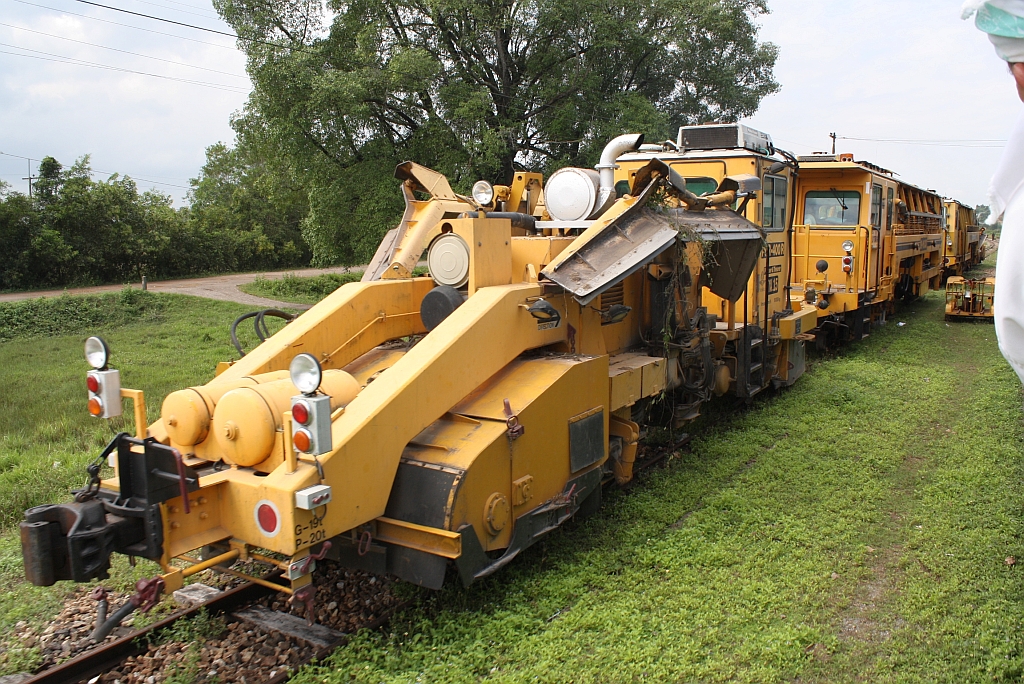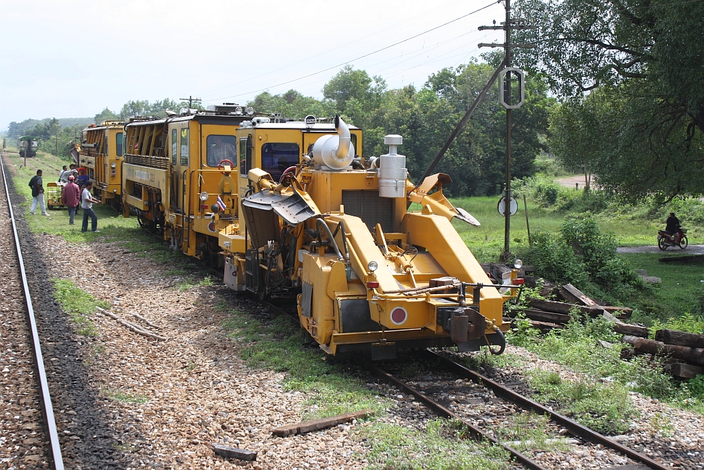 SRT กน.?? (กน.=BR./Ballast Regulator) eine Schotterkehr- und Planiermaschine der Type PBR-400R mit weiteren Oberbaufahrzeugen am 11.Jänner 2012 in der Ta Paet Station.