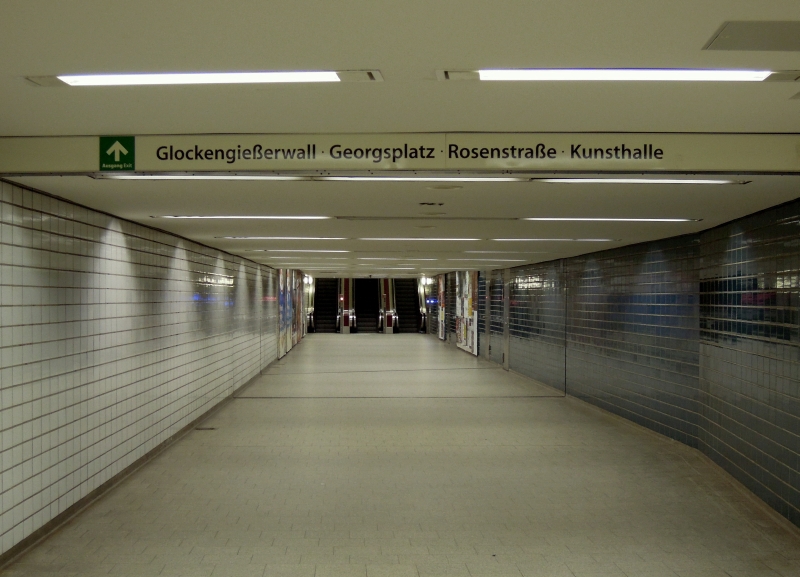 Überhaupt wirkt die Hamburger U-Bahnstation "Hauptbahnhof-Nord" irgendwie verlassen und ungemütlich: obwohl hier die U 3 verkehrt, kann man mittags, kurz vor eins, menschenleere Gänge fotografieren. 16.2.2012