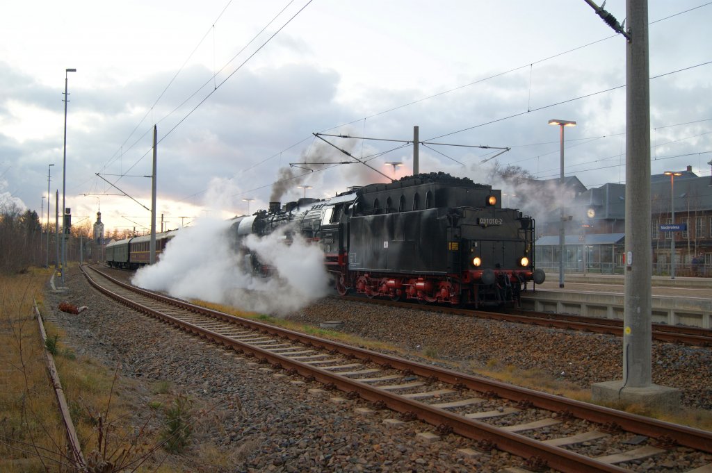 Döllnitzbahn 99 1574-5 mit der DBG 206 nach Mügeln, kurz vor der Abfahrt am 02.01.2012 in Oschatz.