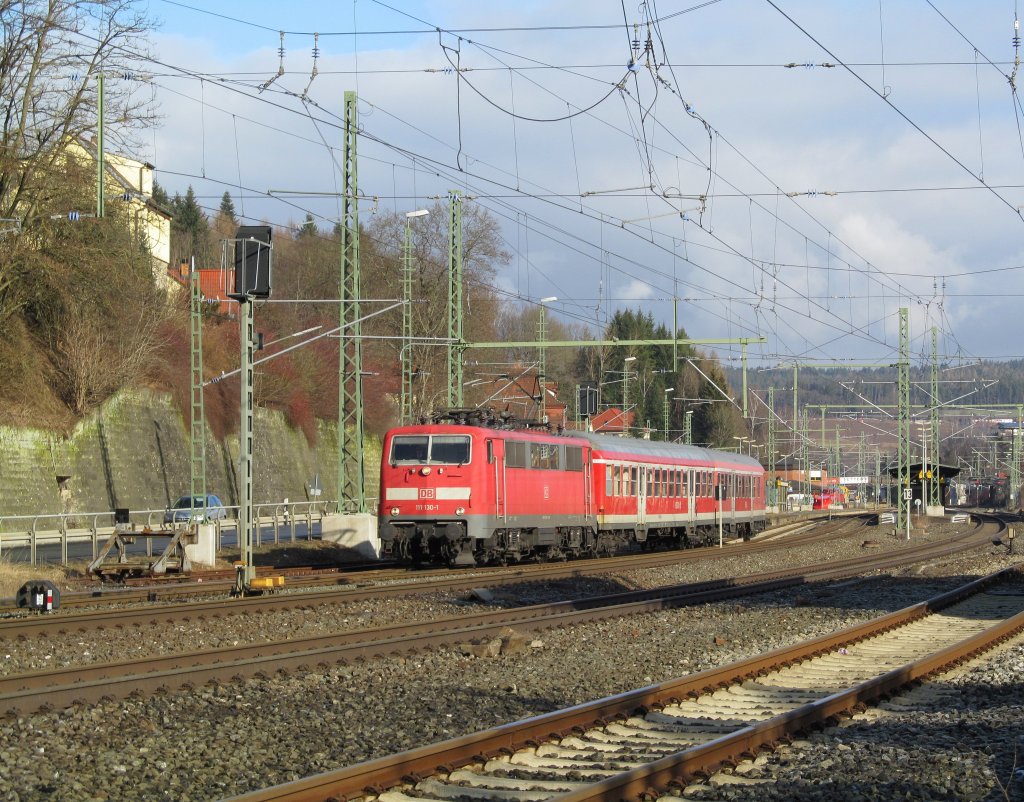 111 130-1 steht am 20. Februar 2012 mit einer Regionalbahn nach Bamberg auf Gleis 4 in Kronach.