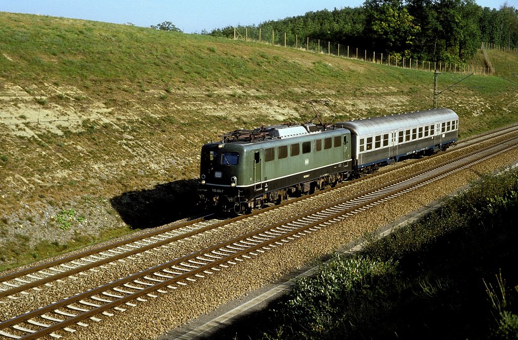 Die Regionalbahn nach Rothenburg wurde am 17.10.00 etwa 1,5 km westlich von Steinach fotografiert. Sie wird gleich unter der Brücke der Autobahn A7 hindurch fahren. (Blick nach Osten)
