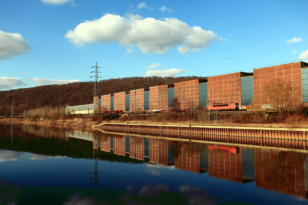 DB 120 112-8 wartet am Münchner Ostbahnhof auf ihre Autotransport die sie zum Hauptbahnhof ziehen wird, während die von einer Rangierlok überholt wird.