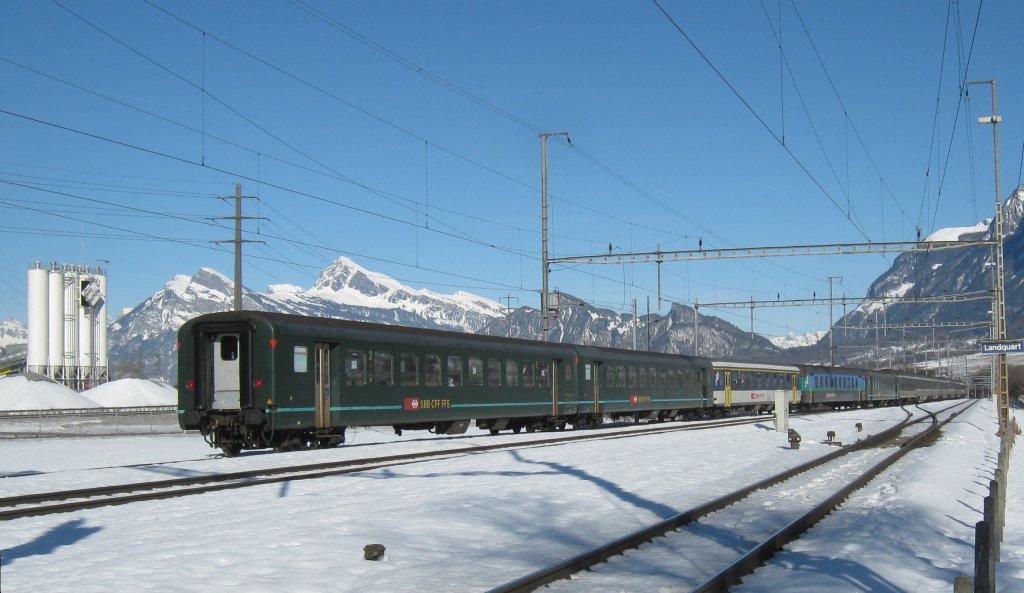 5 EWI/II Verstärkungswagen am IR 1772. In der Mitte der Verstärkungswagen ist ein A EWI NPZ, welcher eigentlich nur im Regionalverkehr eingesetzt wird, 18.02.2012.