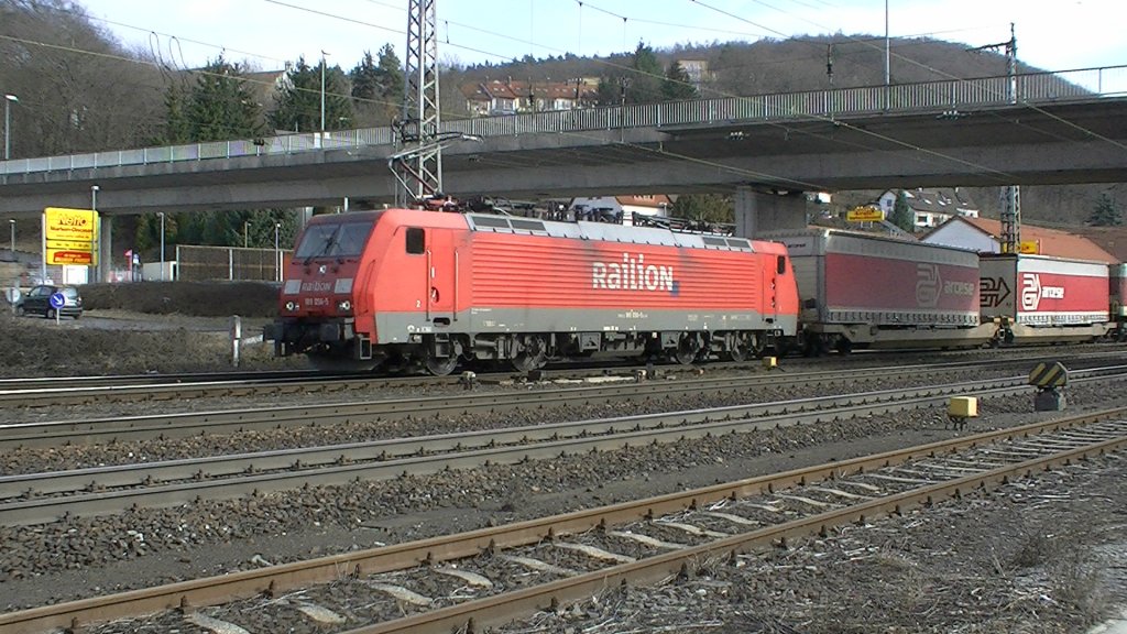 BR 189 Railion trifft am 21.02.2012 mit einem Sattelaufliegerzug im Bahnhof Gemünden am Main ein.