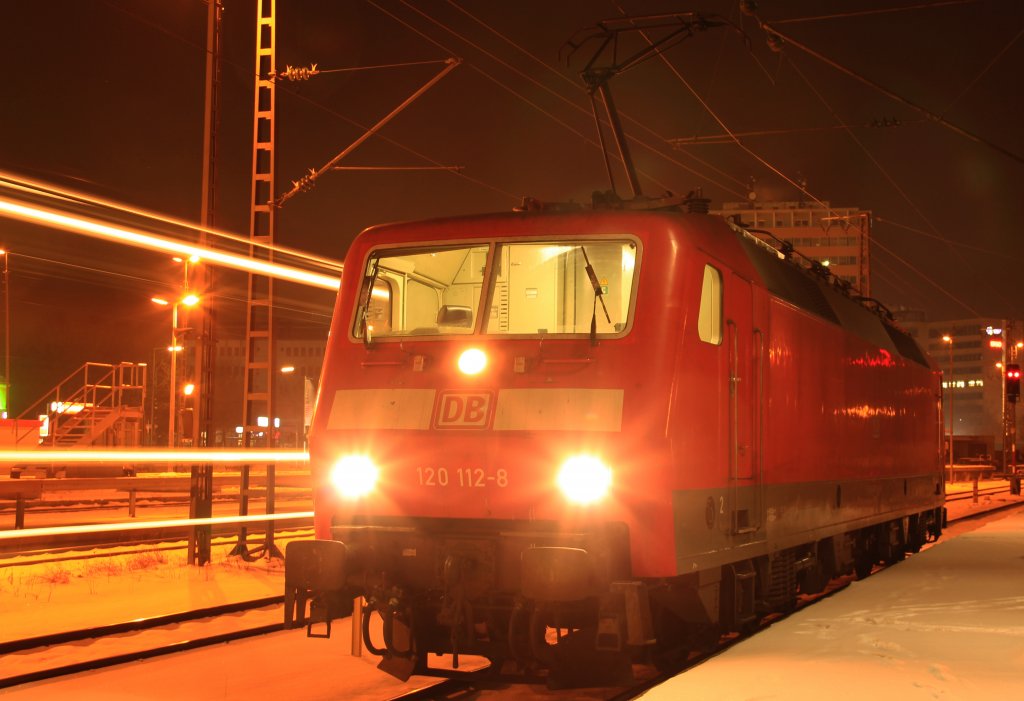 DB 120 112-8 wartet am Münchner Ostbahnhof auf ihre Autotransport die sie zum Hauptbahnhof ziehen wird, während die von einer Rangierlok überholt wird. München Ost, 11.02.12