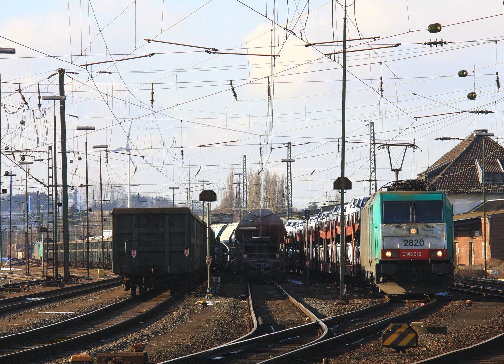 Die Cobra 2820 steht in Aachen-West mit einem Autozug und wartet auf die Abfahrt nach Belgien bei Sonne am Rosenmontag 20.2.2012.