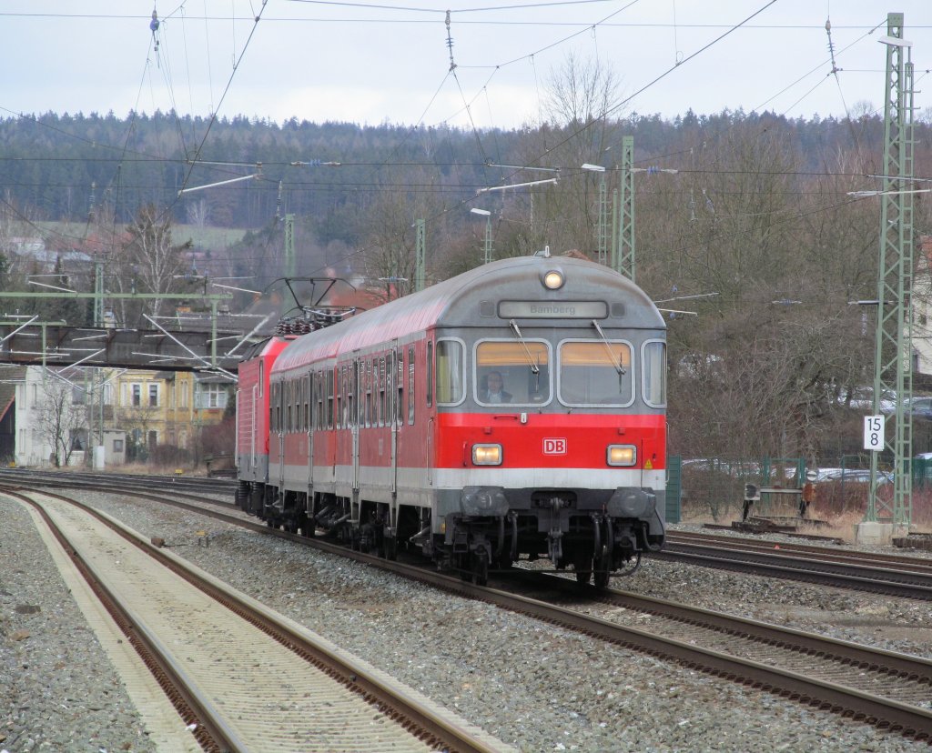 Eine Regionalbahn von Saalfeld nach Bamberg erreicht am 20. Februar 2012 den Bahnhof Kronach. Am Zugschluss schiebt außerplanmäßig 143 200-4.