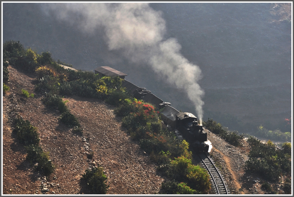 Bei Shegerini schraubt sich die Bahn, durchaus vergleichbar mit der Albulastrecke bei Bergün, in grossen Kehren in die Höhe und so sind von einer zur andern Ebene solche Aufnahmen möglich. (31.01.2012)