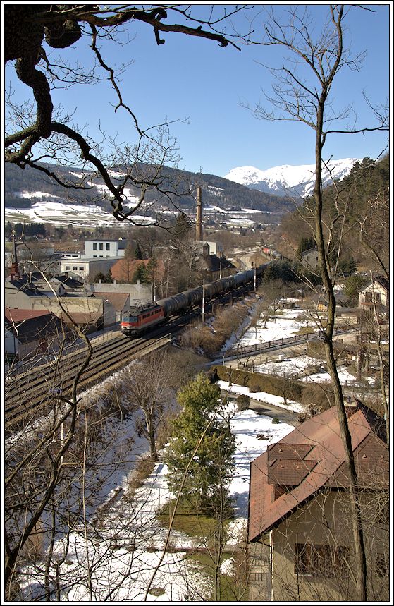 Lok der Rh 1142 schiebt einen Kesselwagenzug, geführt von einer 1116, bei Schlöglmühl nach, 21.2.2012