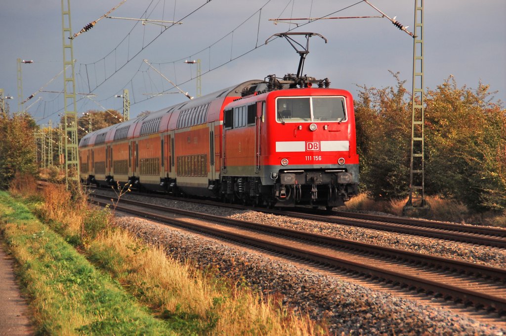 111 130-1 verlässt am 20. Februar 2012 mit einer Regionalbahn nach Bamberg den Kronacher Bahnhof.