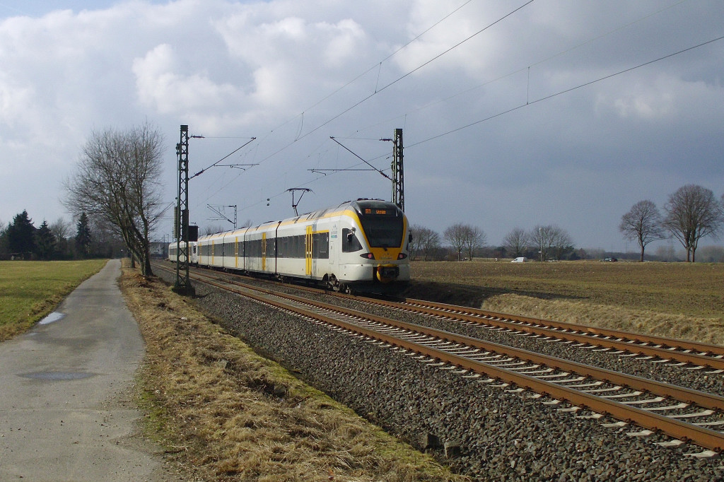 Nachschuß auf den ET 7.13 auf der KBS 485 bei Korschenbroich. Der Triebwagen läuft im Verband auf der RE13 nach Venlo am Rosenmontag den 20.2.2012