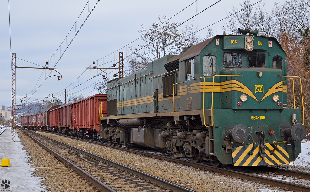 SZ 664-106 zieht Güterzug durch Maribor-Tabor; Fahrtrichrung Verschiebebahnhof Maribor-Tezno. / 17.02.2012