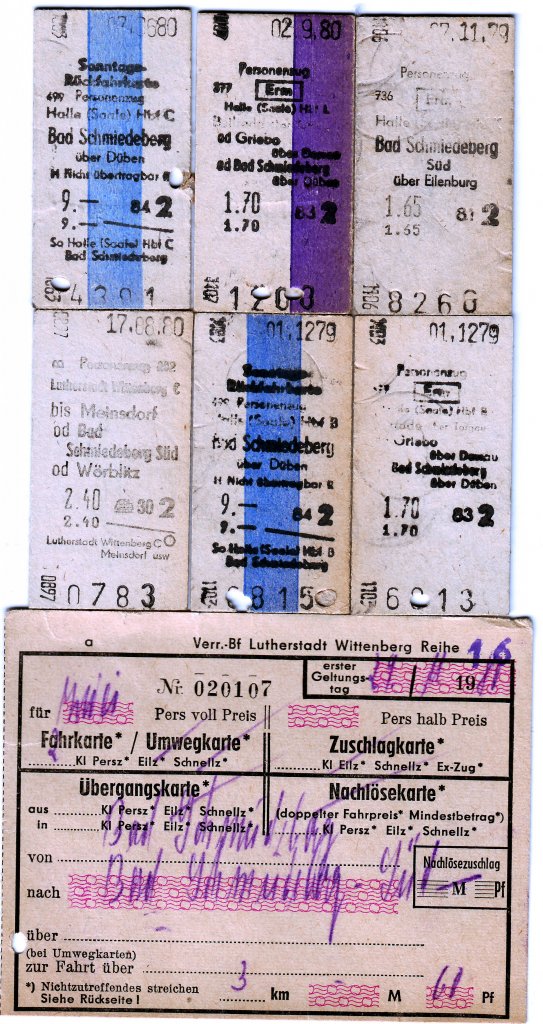 Hier ist auch mal eine preiswerte Schülerfahrkarte dabei, als verheirateter Student konnte man eine ermäßigte Fahrkarte zu den Schiegereltern lösen, aber es wußte ja kein Schaffner, wo die Schwiegereltern wohnten, das entsprechende Formular für das Lösen der Fahrkarte gab beim Referat E&A(Erziehung und Ausbildung) blanko, so daß die Schwiegereltern manchmal über die ganze DDR verteilt wohnten.