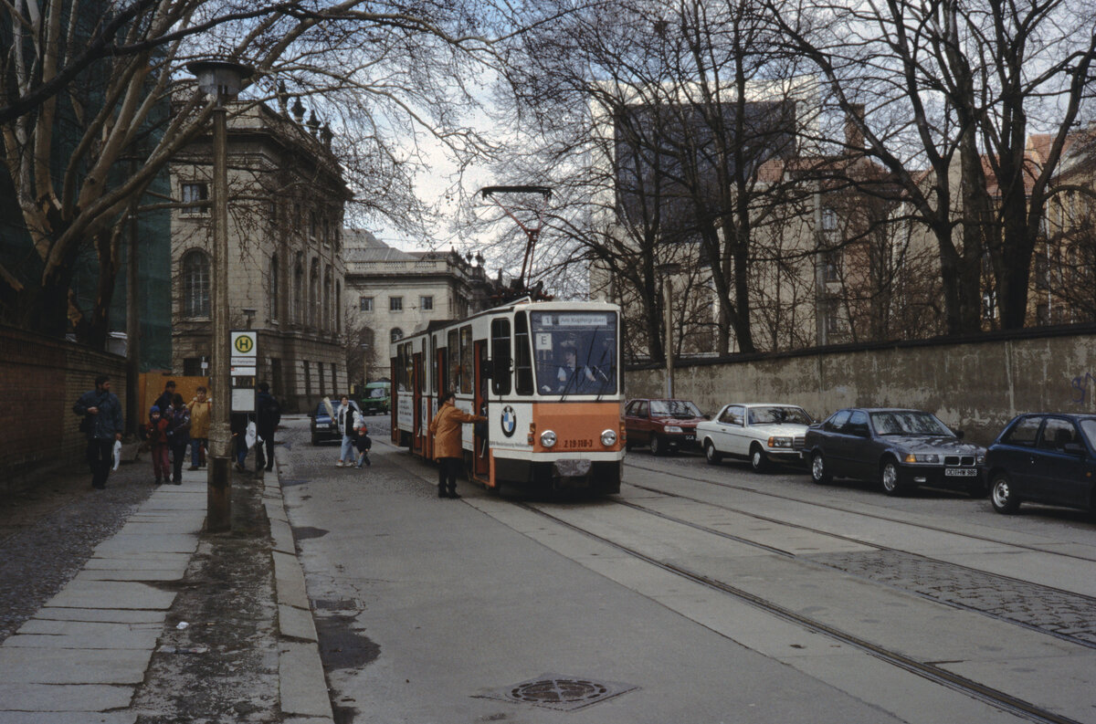 Berlin BVG SL 1E (KT4D 219 110-3 (CKD 1979)) Mitte, Clara-Zetkin-Straße am 27. März 1994. - Den Straßennamen Clara-Zetkin-Straße gab es vom Jahre 1951 bis 1995. - Von 1822 bis 1951 hieß die Straße Dorotheenstraße, und diesen Namen trägt sie wieder seit 1995. - Scan eines Diapositivs. Kamera: Leica CL.