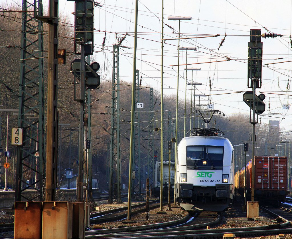 182 601-5 (ES 64 U2-101) der SETG fährt mit einem Getreidezug von Aachen-West in Richtung Köln bei schönem Sonnenschein am Rosenmontag 20.2.2012.