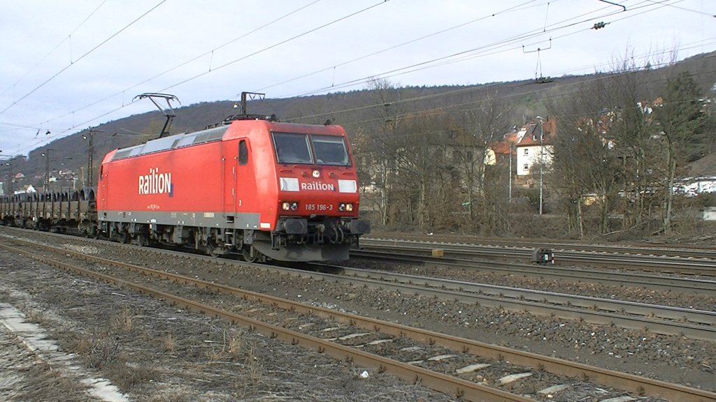 185 196-3 Railion mit einem Stahlrollen-Ganzzug in Gemünden am Main Richtung Würzburg. 21.02.2012
