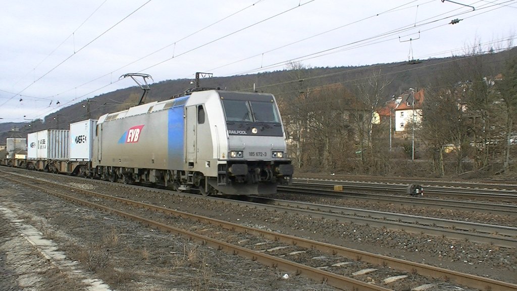185 672-3 Railpool / EVB mit Containerzug am 21.02.2012 durch Gemünden am Main Richtung Würzburg.