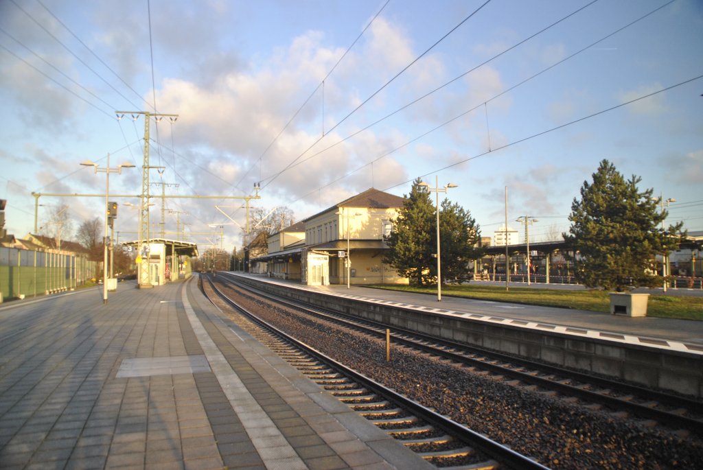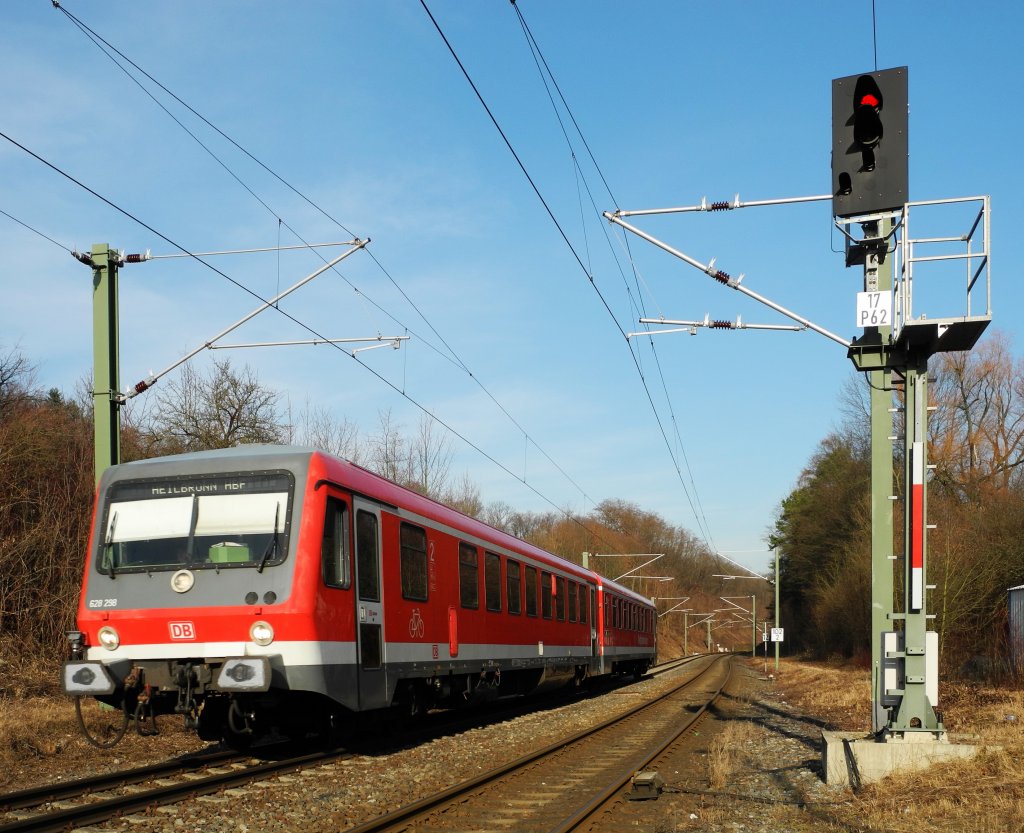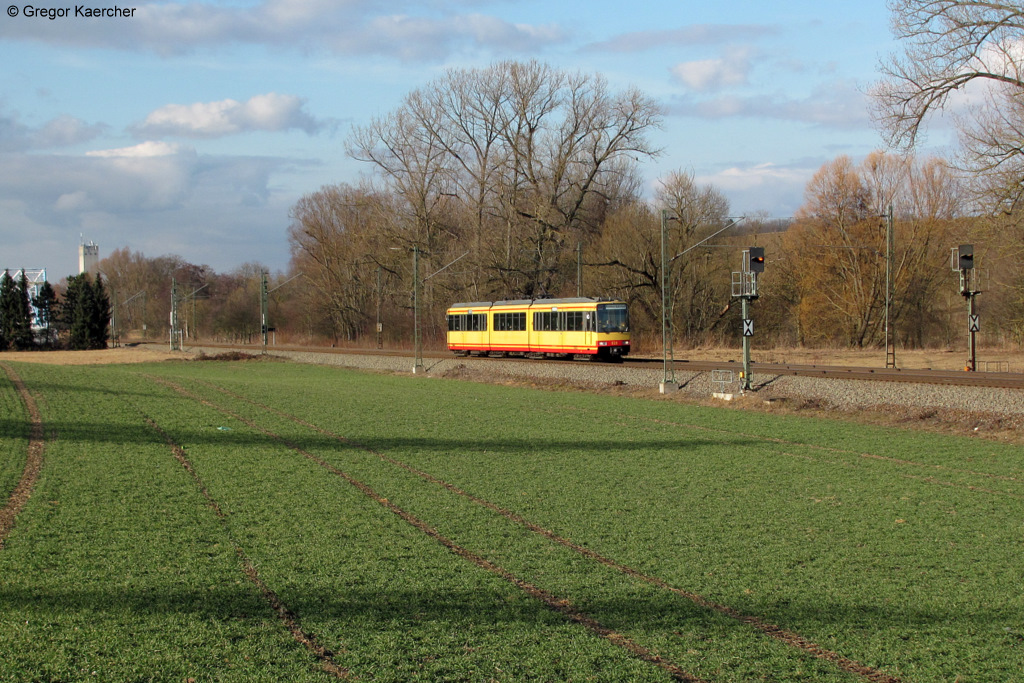 Wagen 828 hat als S9 von Bruchsal nach Bretten Bahnhof sein Ziel Bretten Bahnhof bei Diedelsheim fast erreicht. Aufgenommen am 20.02.2012.