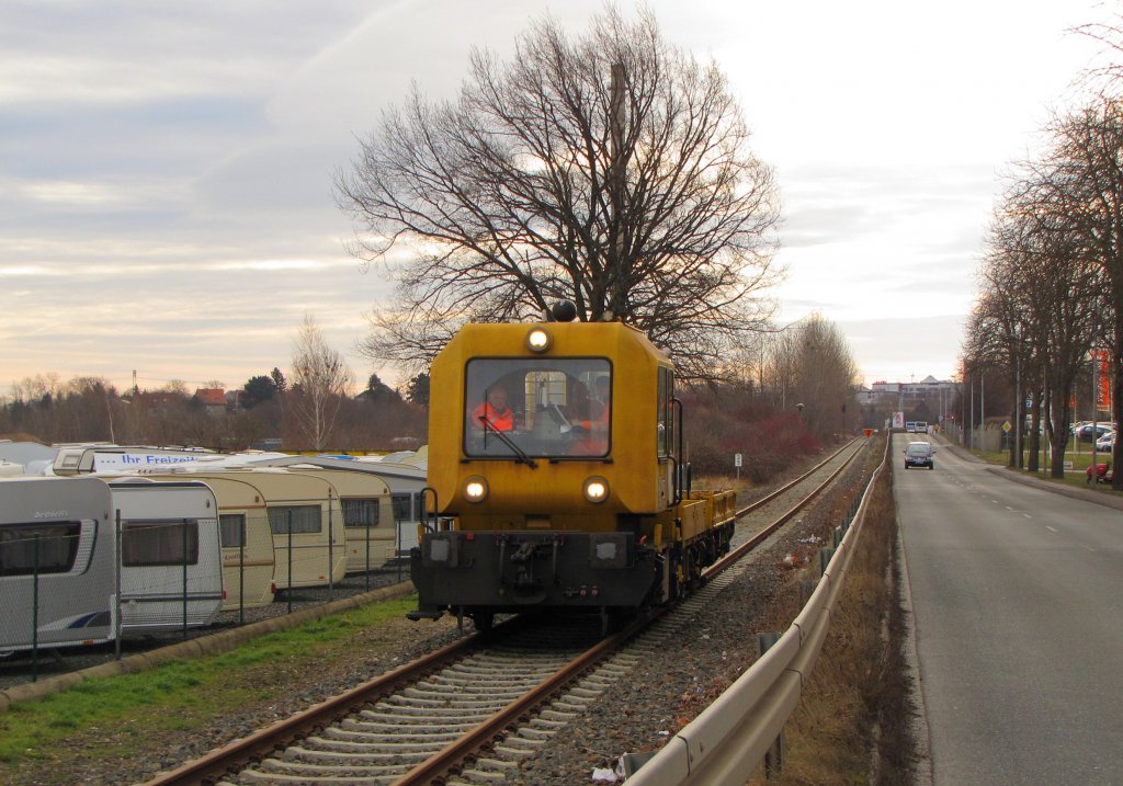 Am Vormittag des 21.02.2012 fuhr dieser DB Netz GAF 100 R aus Richtung Teuchern kommend neben der C.-W.-Gehring-Str. in Richtung Naumburg Ost. Ich fand es schön, mal wieder ein Schienenfahrzeug auf der Strecke zu sehen, zumal der öffentliche Schienenverkehr zwischen Naumbug Ost und Teuchern seitdem 12.12.2010 ruht.