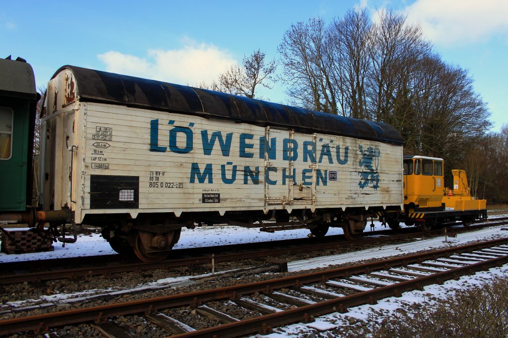 Auf den Gleisen der EFG (Eisenbahnfreunde Grenzland) in Walheim bei Aachen steht dieser alte Löwenbräu-Bierwagen. Er hat fast 30 Jahre in Inden bei einem Getränkehändler als Lagerraum dienend fest gestanden und soll nun restauriert und zum laufen gebracht werden. (20.02.2012)