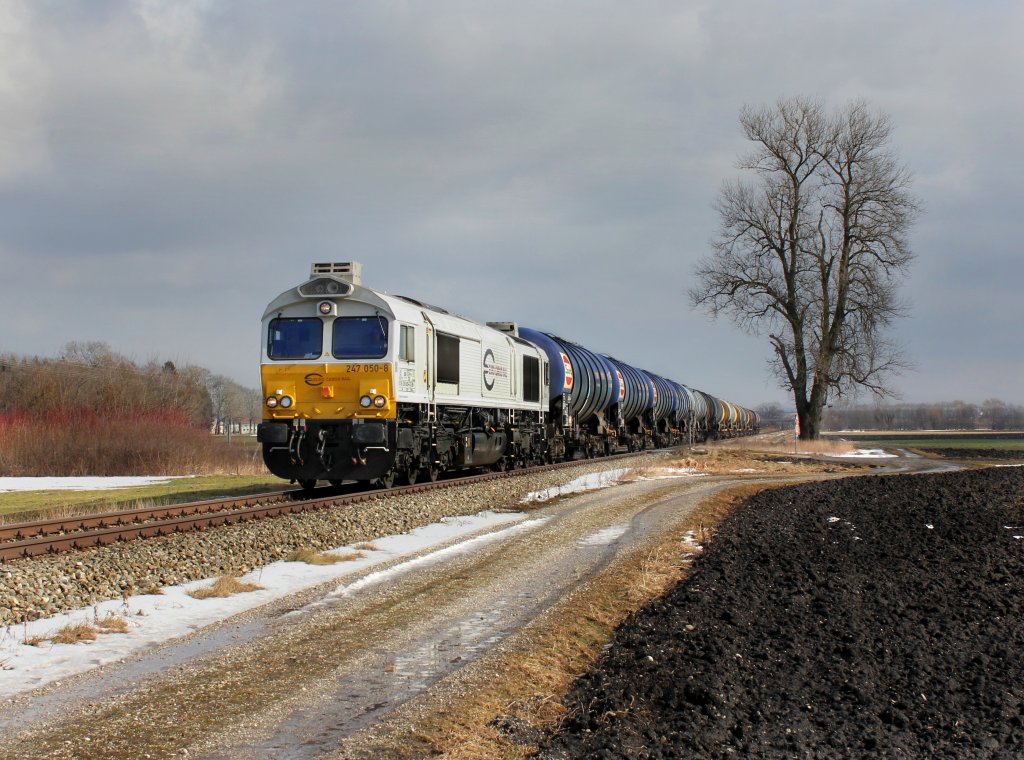 Der 247 050 mit einem Kesselwagenzug am 20.02.2012 unterwegs bei Altötting.