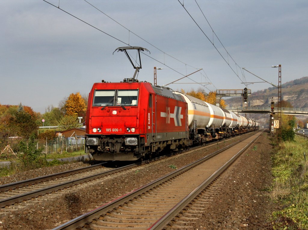 Die 185 606 mit einem Gaskesselzug am 30.10.2010 unterwegs bei Thüngersheim.
