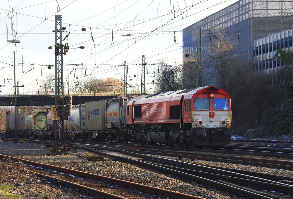 Die Class 66 PB03 "Mireille" von Crossrail kommt mit einem Containerzug aus Belgien und fährt in Aachen-West ein bei Schönem Sonnenschein am Rosenmontag 20.2.2012.