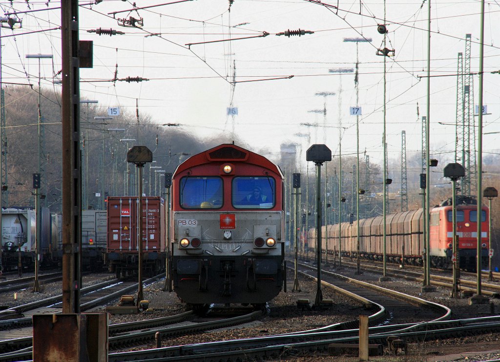 Die Class 66 PB03 "Mireille" von Crossrail rangiert in Aachen-West bei Sonne am Rosenmontag 20.2.2012.