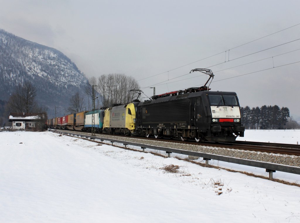 Die ES 64 F4-287, die ES 64 U2-011 und die E 412 006 am 04.02.2012 mit einem KLV-Zug unterwegs bei Niederaudorf.