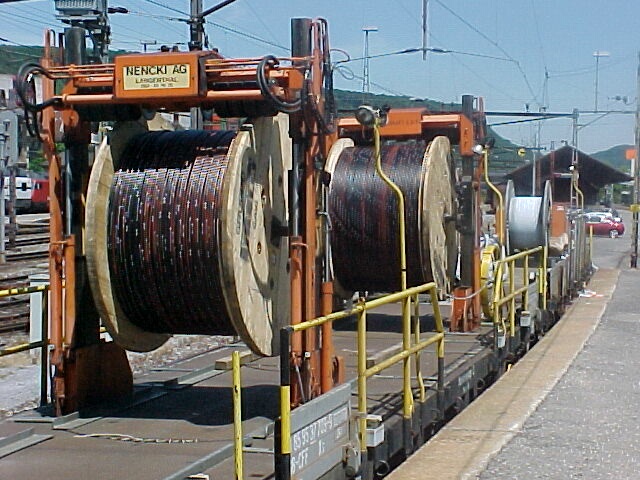 Kabelverlegeeinheit bestehend aus drei Wagen, beladen mit Glasfaserkabelbobinen.