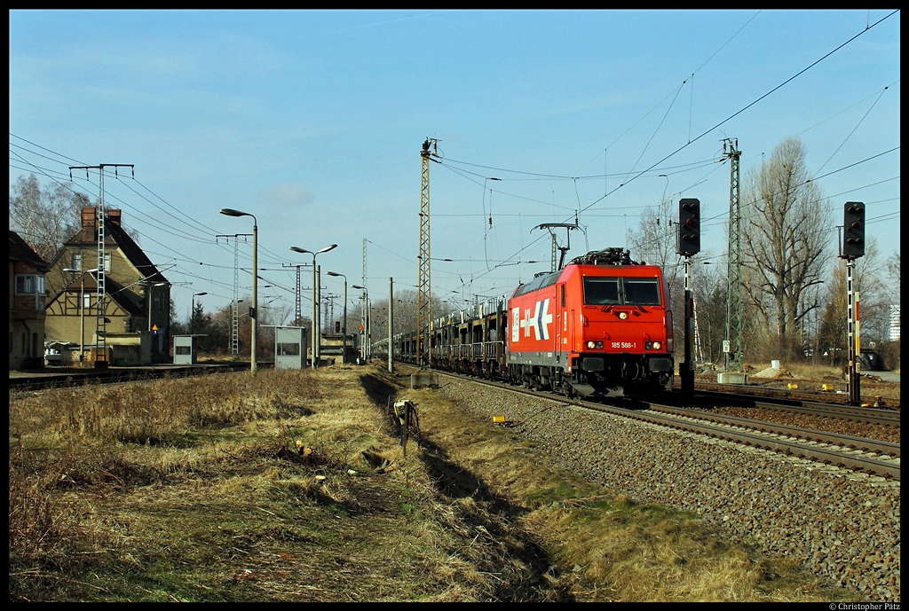 Mit einem leeren Autozug nach Zwickau-Mosel fährt 185 588-1 der HGK am 22.2.2012 durch Leipzig-Thekla.